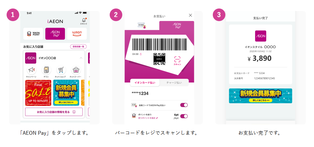 AEON Payがあれば、イオングループの各店舗でスマホ決済が利用可能となります。