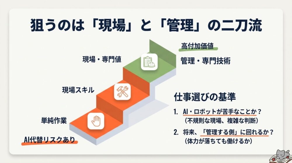 資格一覧を見てイメージが湧いたら、次は「その仕事が長期的に強いか」を判断します。私は、ブルーカラーは確実に儲かるという考え方はおすすめしません。求人が多いことと賃金が大きく上がることは別で、賃金は需給だけでなく価格転嫁・責任・役割設計で決まる部分が大きいからです。