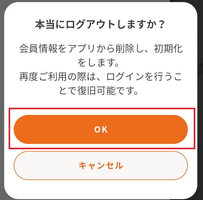 「本当にログアウトしますか?」という画面が表示されるため、赤枠のOKをタップします。