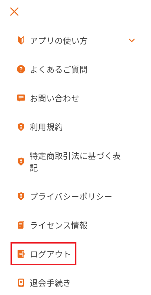 以下の画面が表示されるため、赤枠のログアウトをタップしましょう。