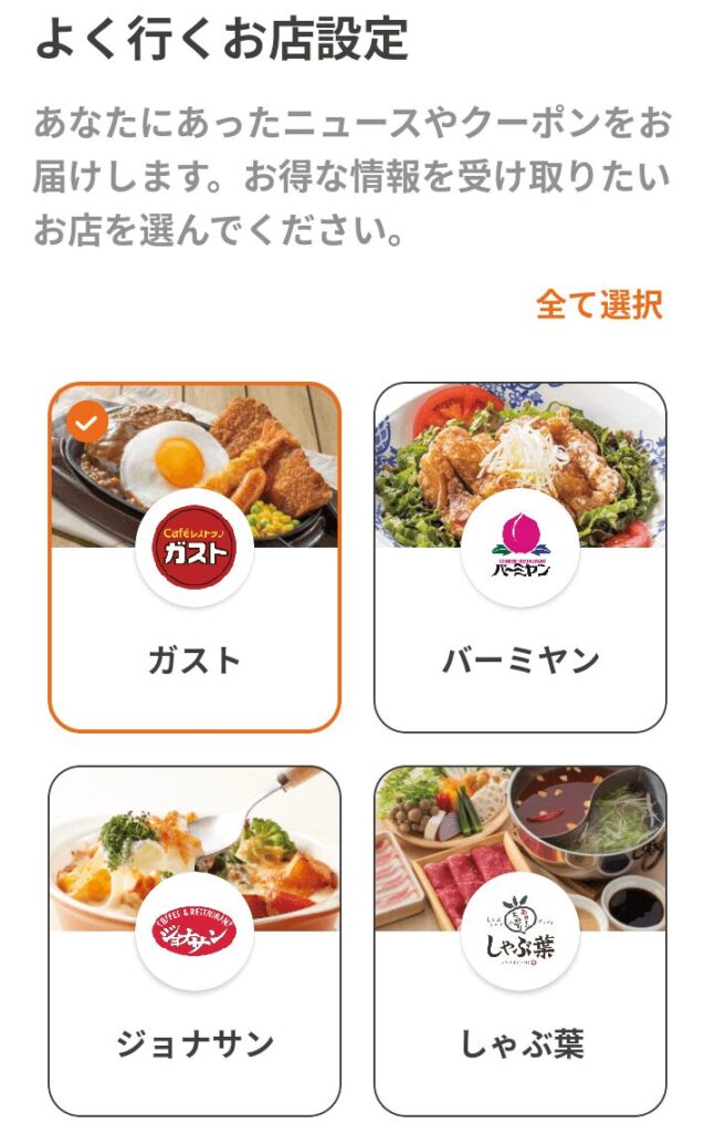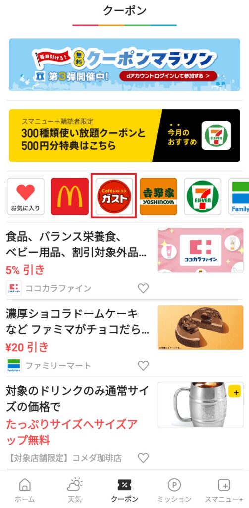 クーポン一覧画面が表示されるため、ガストを選択します。