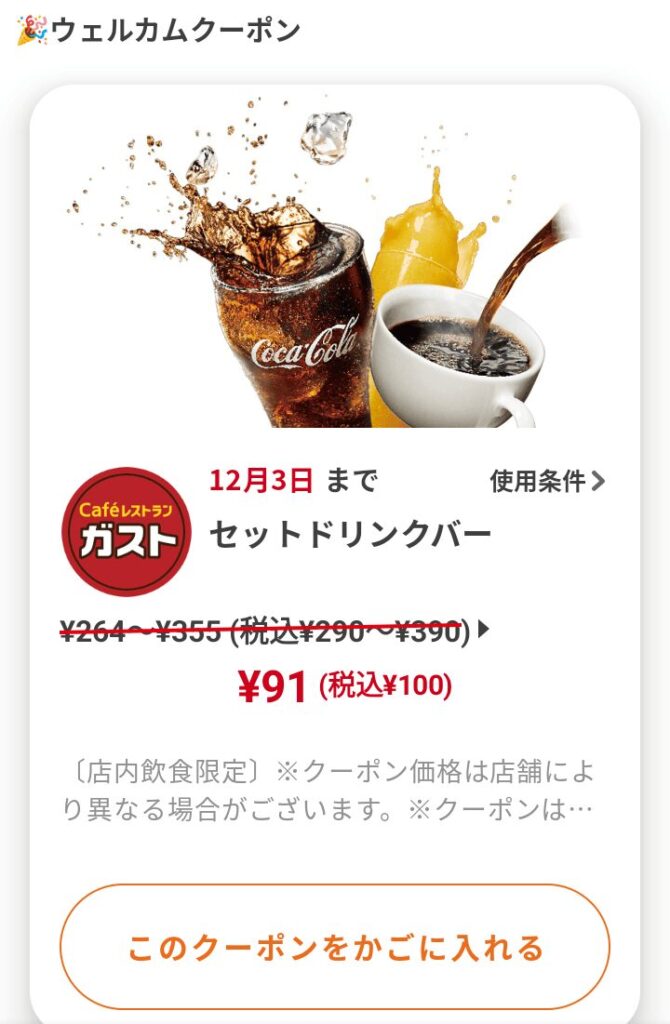 ウェルカムクーポンであるドリンクバー100円クーポンが復活しているため、利用しましょう。