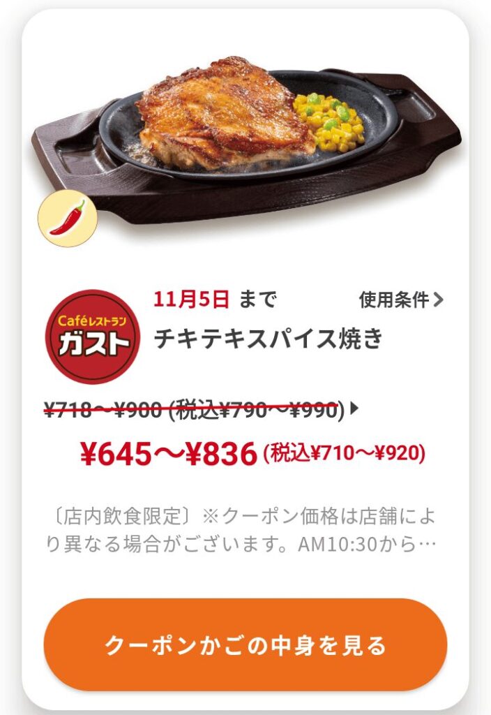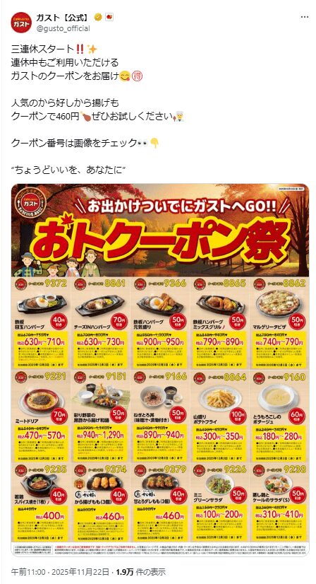 ガストは日常的にクーポンを配布しており、公式X(旧Twitter)でもポストしています。