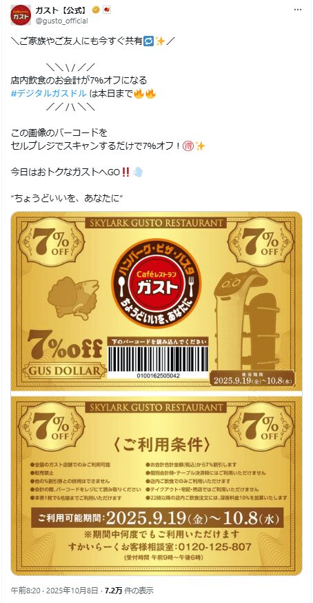 ガスト公式X(旧Twitter)では、会計時に利用することで、7%OFFになるクーポンを一月に1回ほど配布しています。