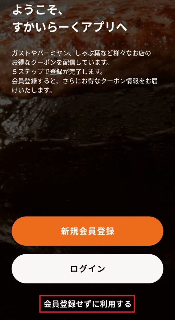 インストール後は、会員登録を求められますが、登録をしなくてもガストのクーポンは利用可能です。