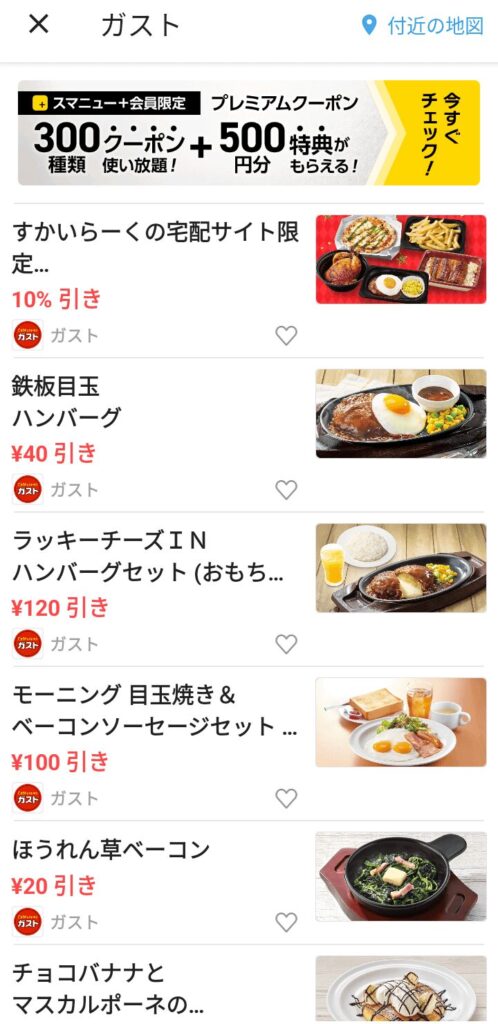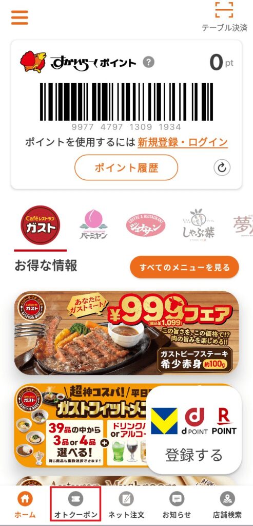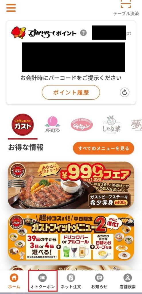 最初に紹介するのが「すかいらーく公式アプリ」が配布しているガストのクーポンです。