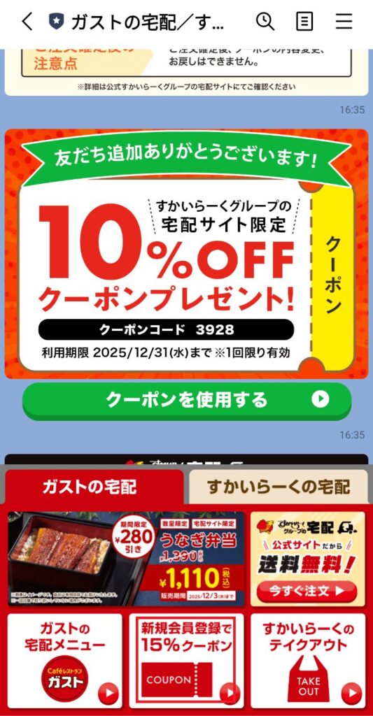 ガストの宅配/すかいらーくの宅配LINEアカウントでは、友達追加をすることで、初回限り会計10%OFFクーポンを配布しています。