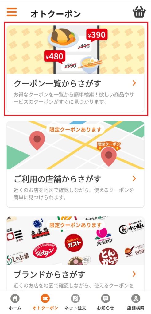 オトクーポン画面が表示されたら「クーポン一覧からさがす」をタップしましょう。(下の2項目でも確認可能。)