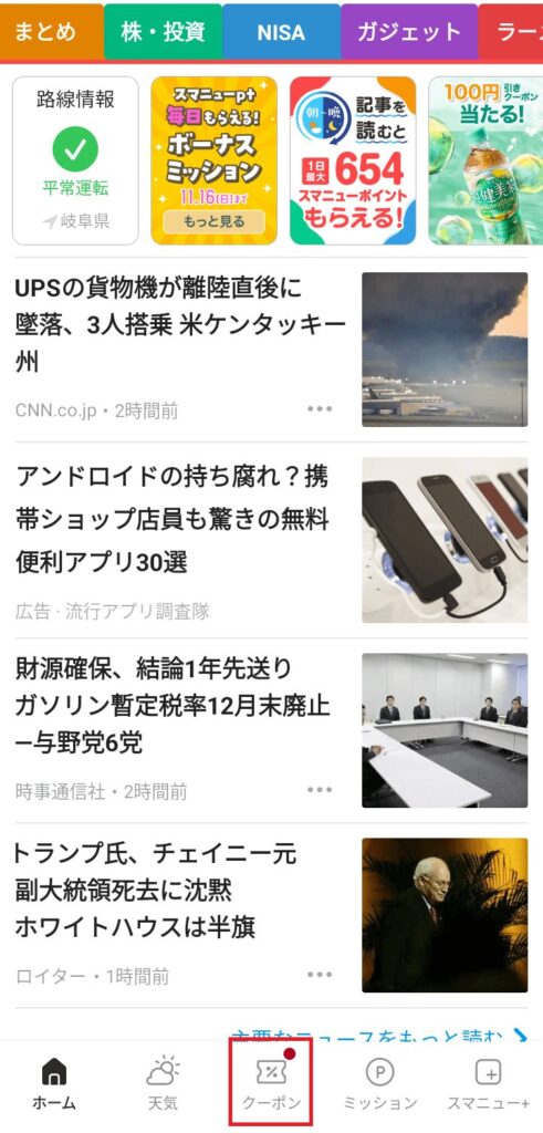 まずは、スマートニュースのトップ画面を表示させます。続いて、画面下面の赤枠「クーポン」をタップしましょう。