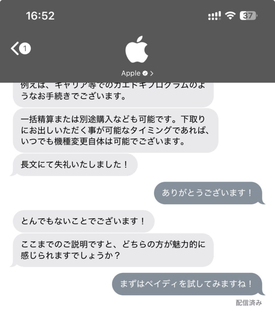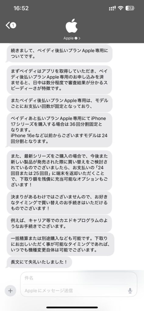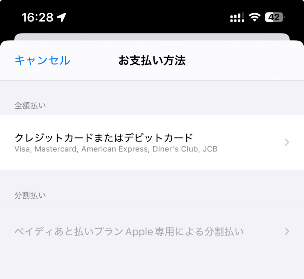 前まではここにオリコショッピングローン(分割払い)が表示されていたのですが、「ペイディあと払いプランApple専用による分割払い」しか出てこなくなってます。