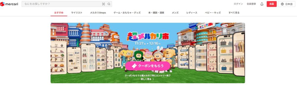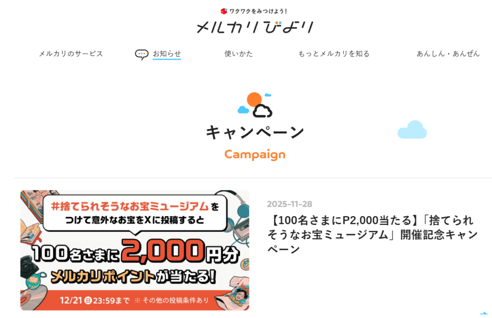 クーポン配布とキャンペーン開催の最新情報を確認するには、以下のメルカリ公式サイトを確認することをおすすめします。(会員登録すればメールで情報が配信される)