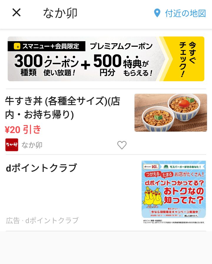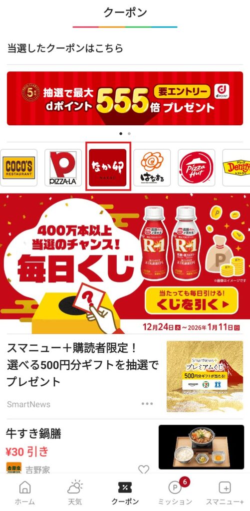 ニュースアプリである「スマートニュース」も、なか卯のクーポンを配布しています。